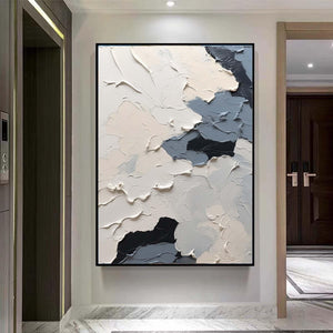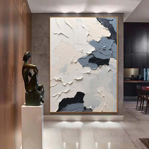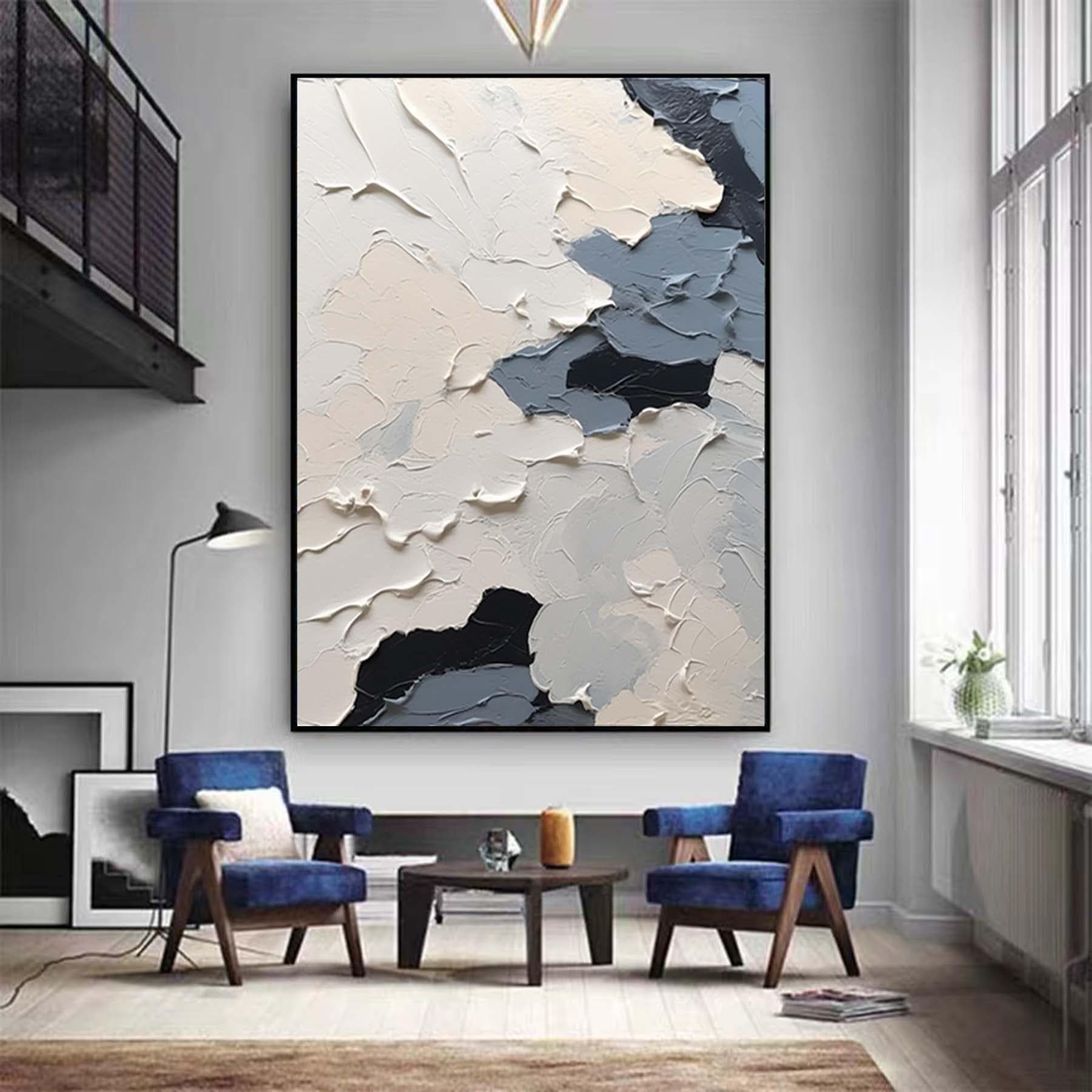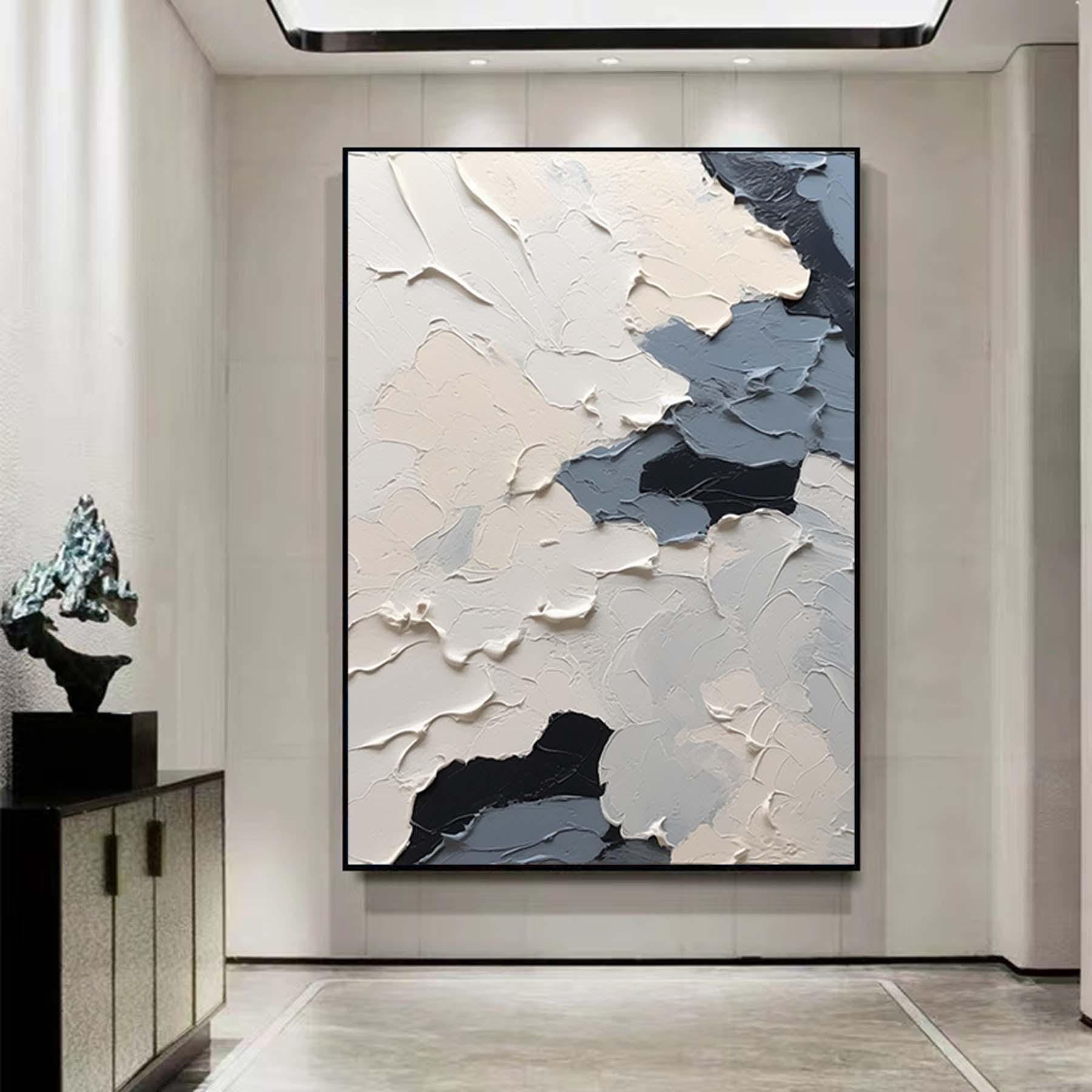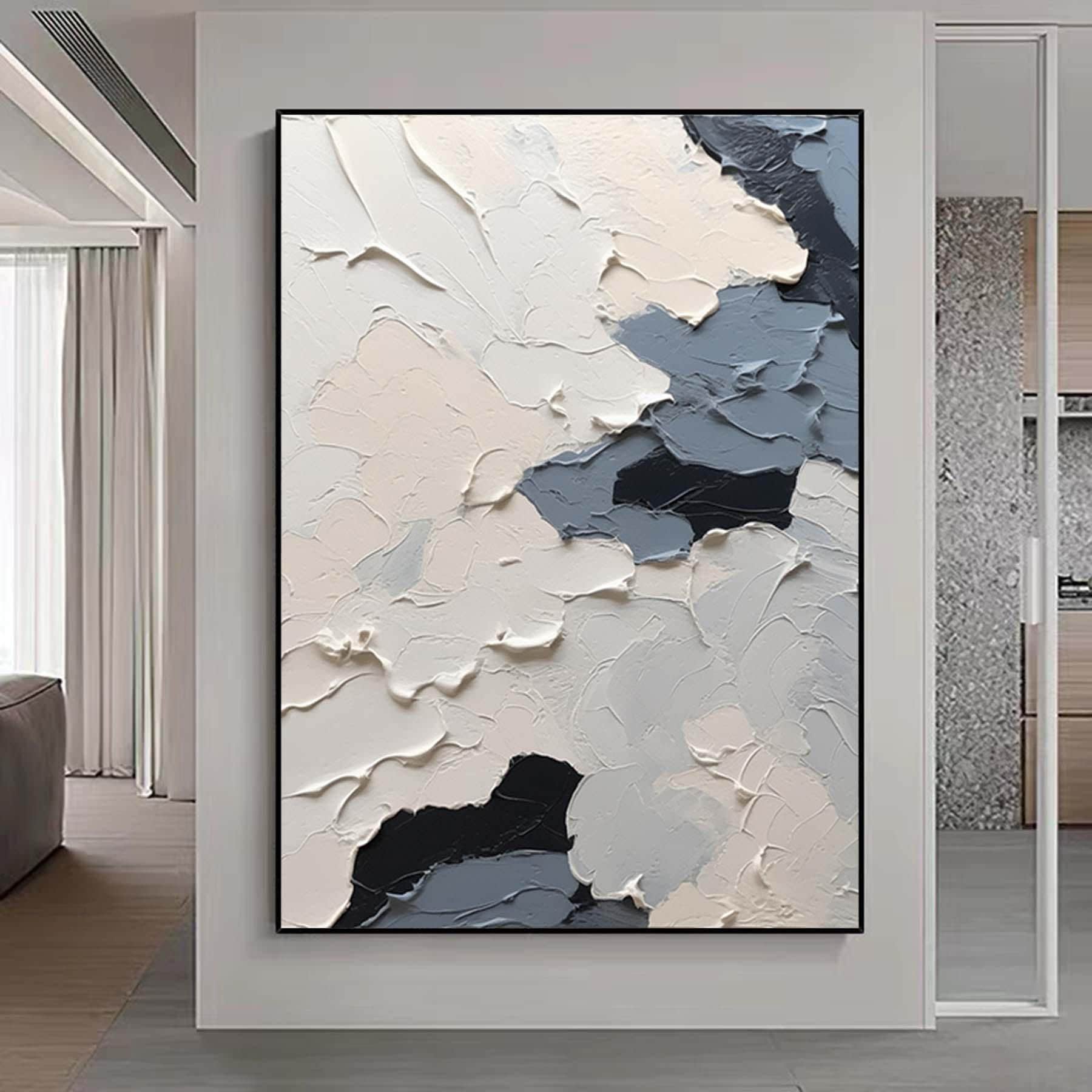 Large Nordic white abstract, navy blue modern living room abstract painting, white 3D texture painting, minimalist art, neutral art