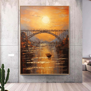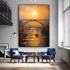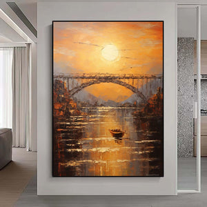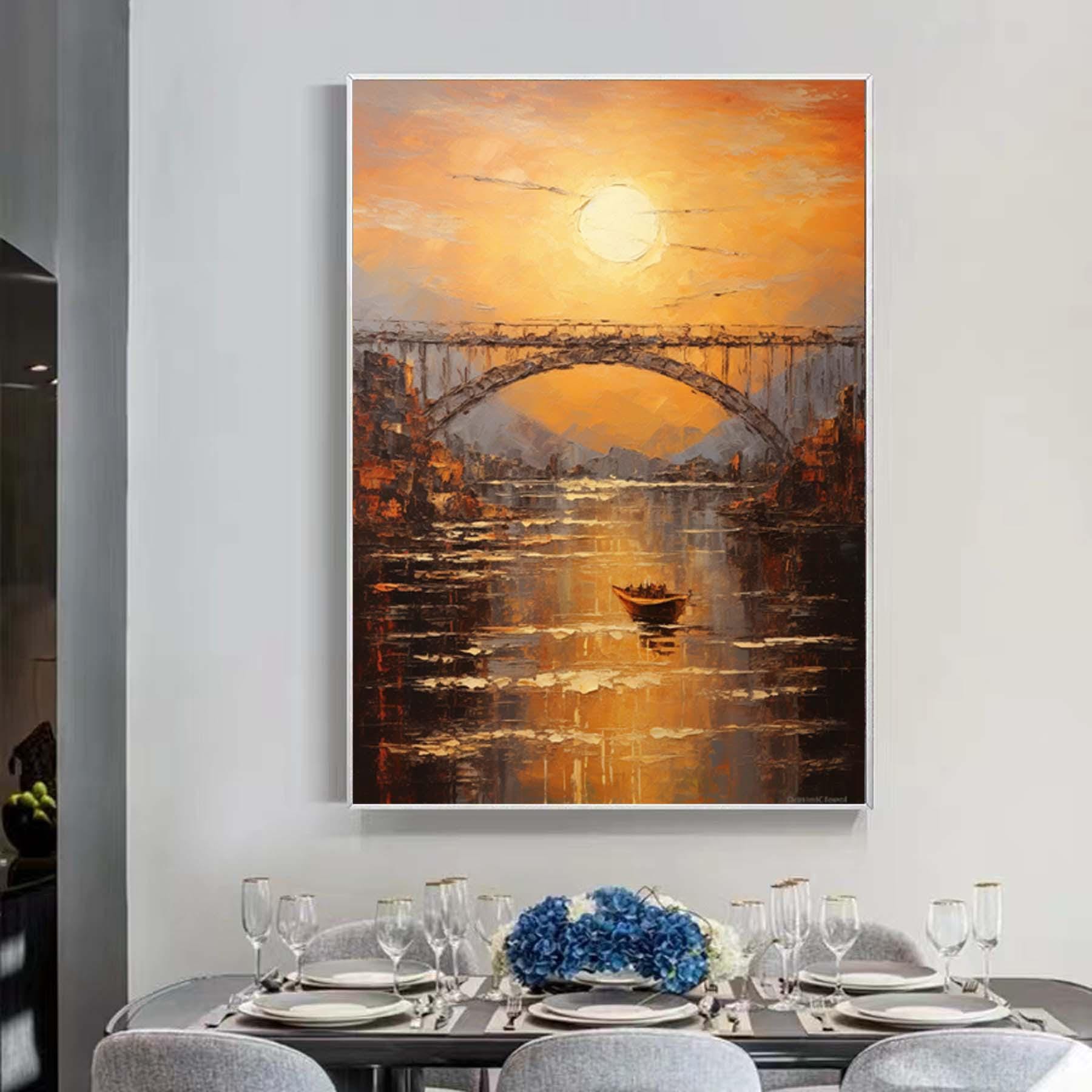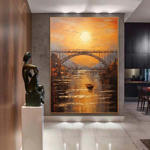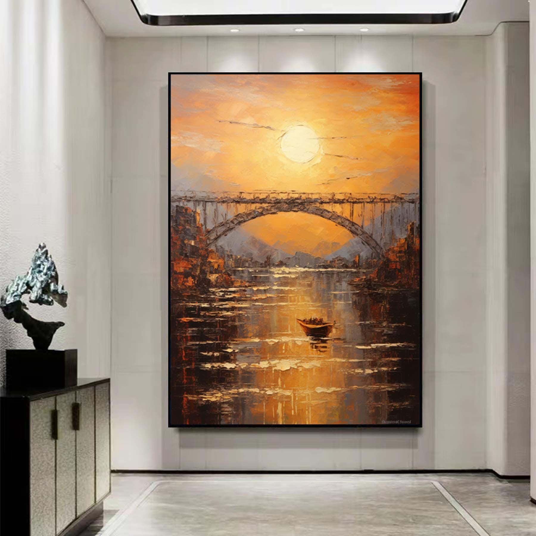 Abstract sundown on bridge Wall Art,Large morning sunrise painting,Original textured landscape canvas art,Nautical painting art on Canvas