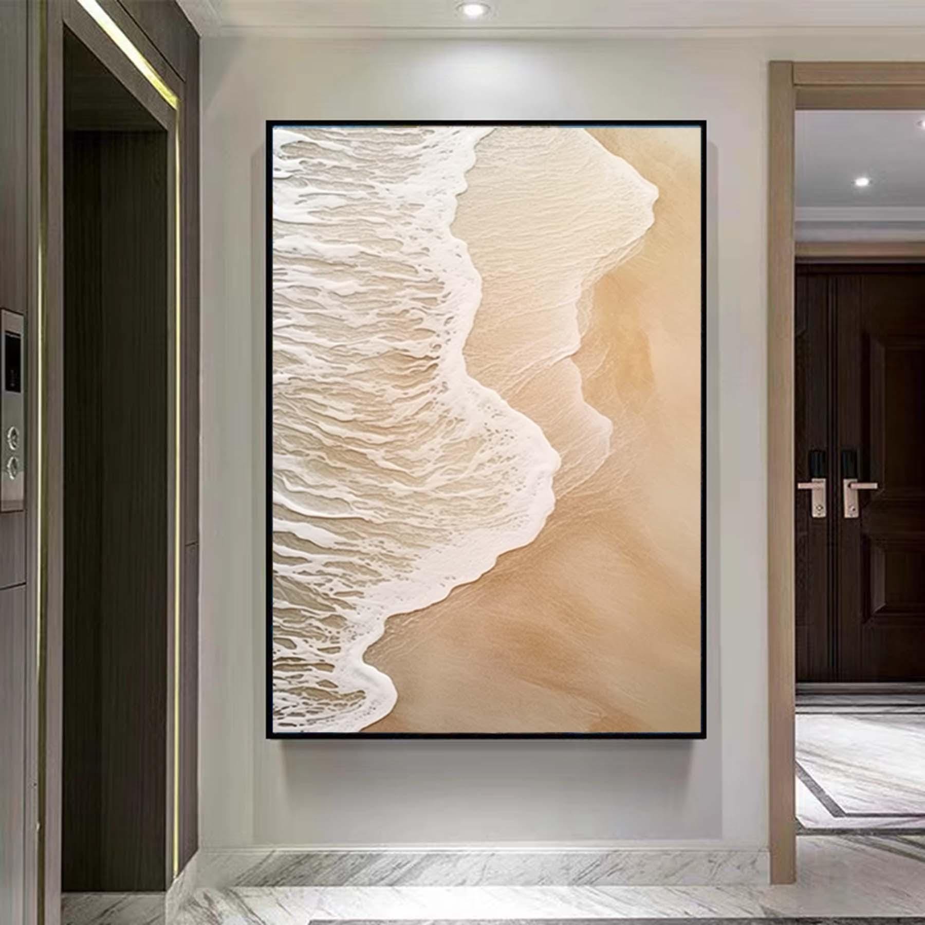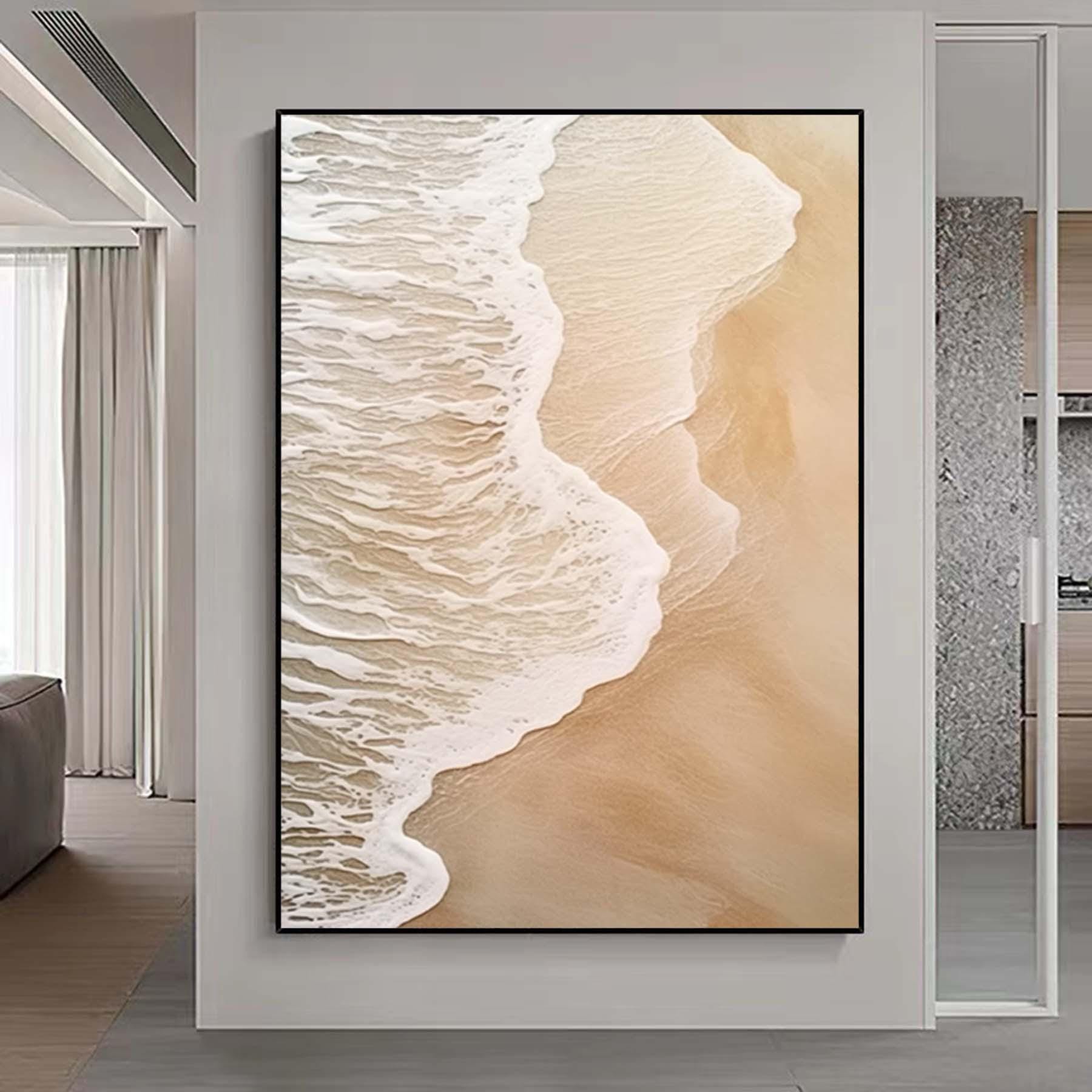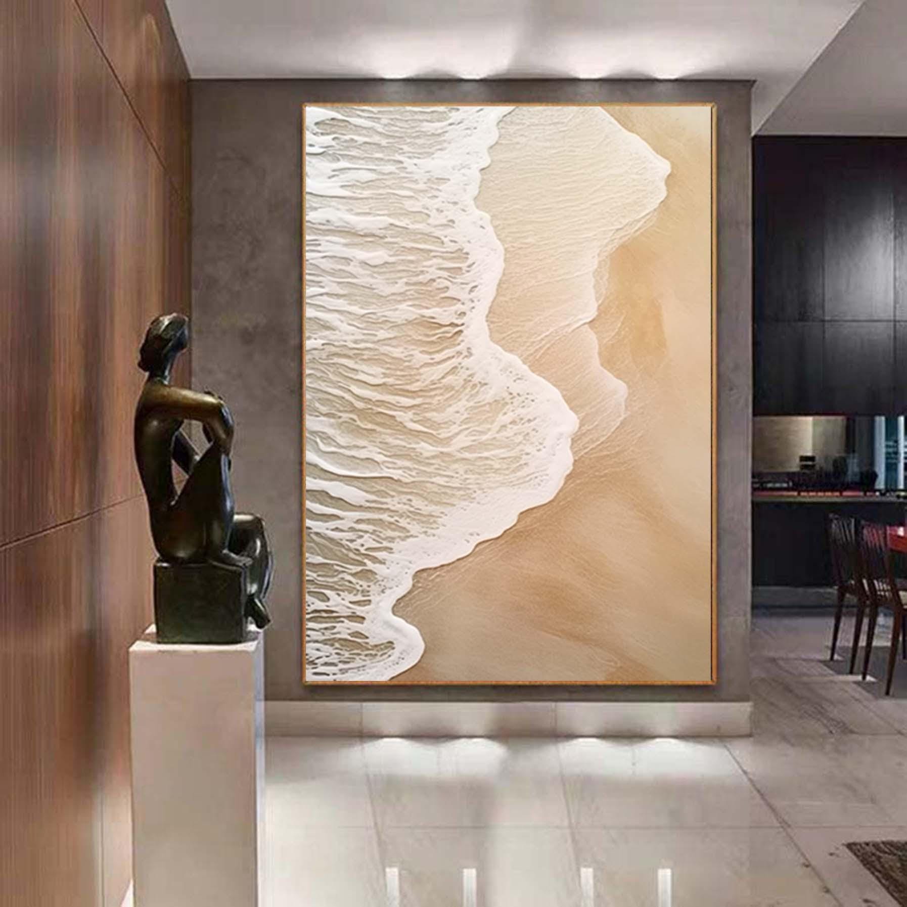 Extra Large Wabi-Sabi Seawaves Painting,Large Beige White 3D Textured Painting,Oversized Textured Minimalist Abstract Wall Art for Home