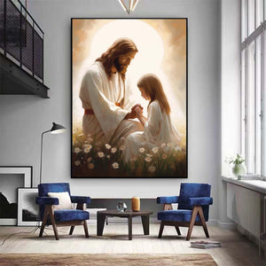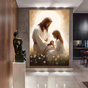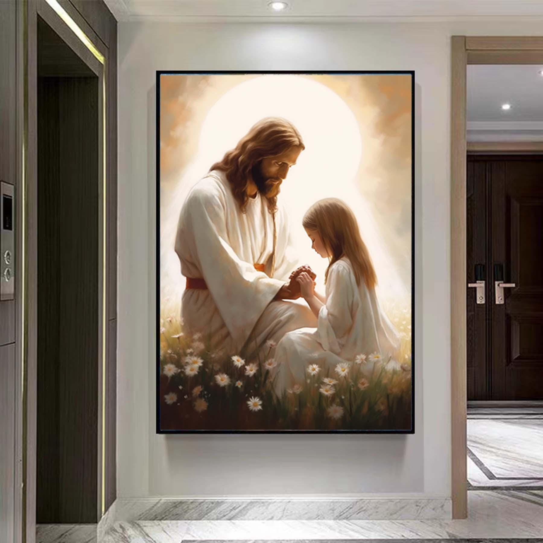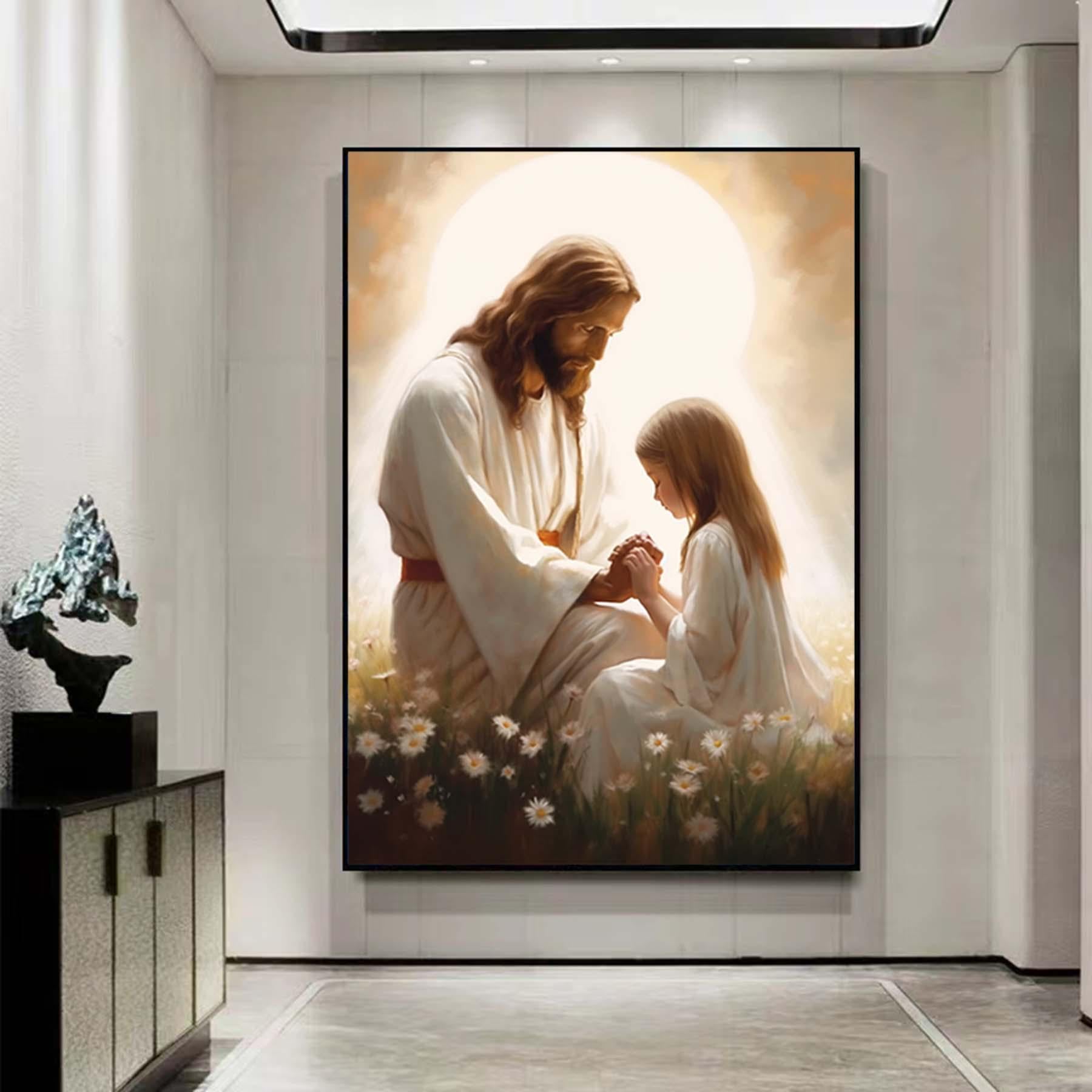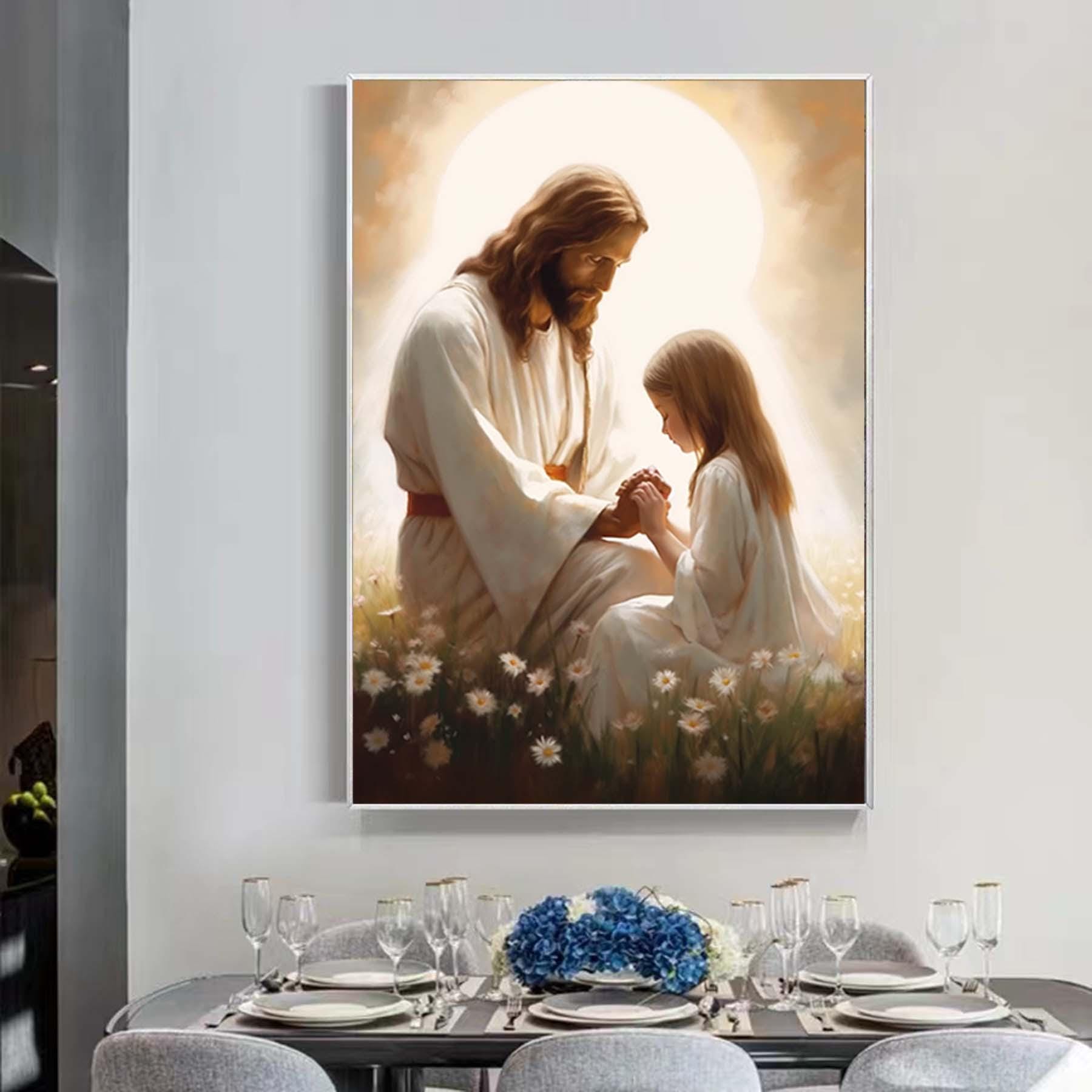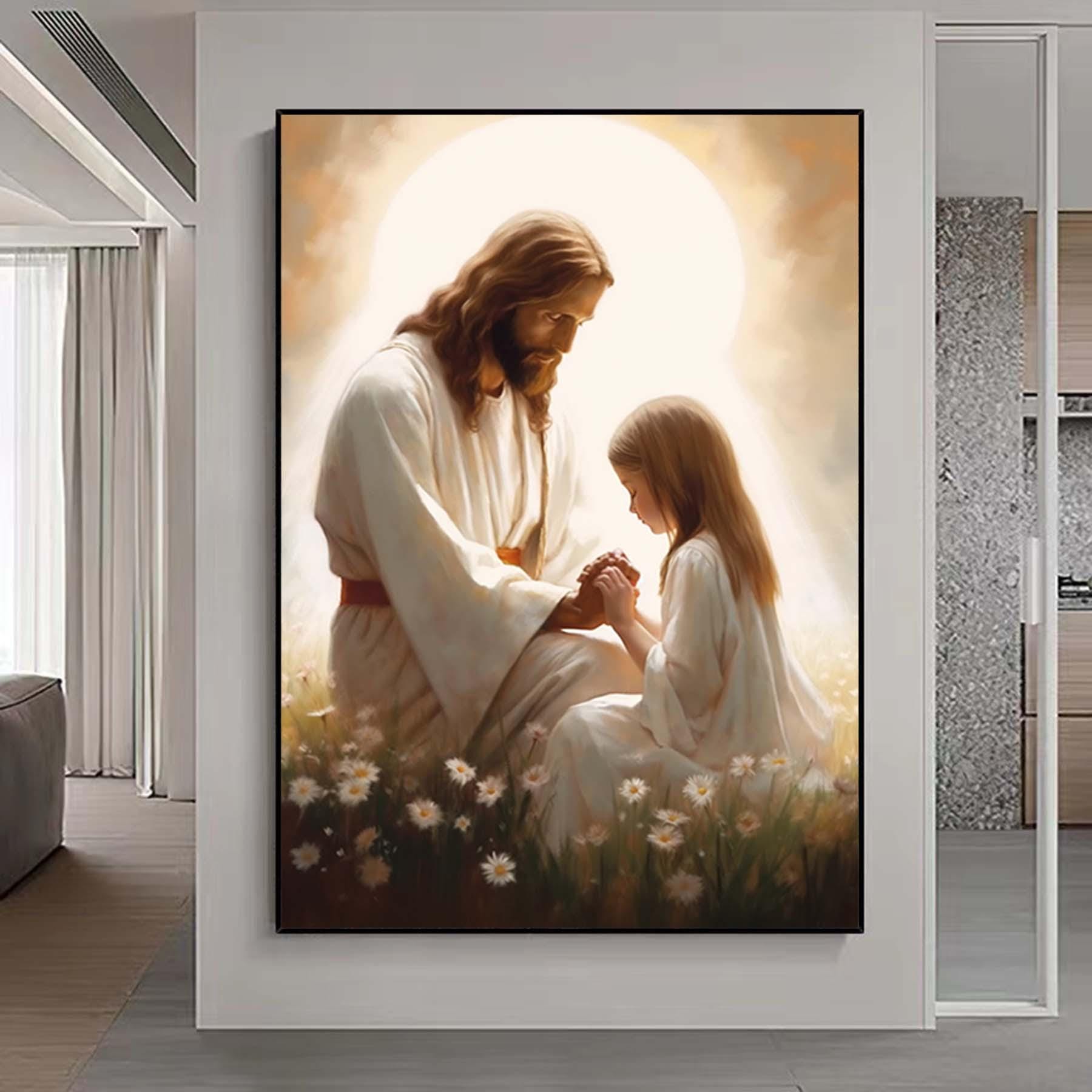 Large Jesus and Girl Praying Painting,Abstract Textured Christian Art, Jesus with Girl Wall Art, Bible Verse Wall Art,Religious Painting