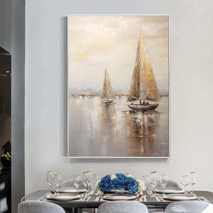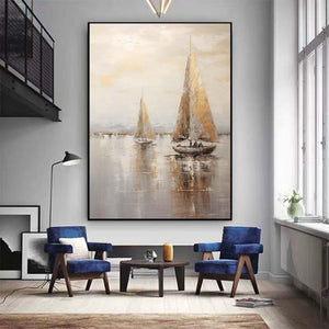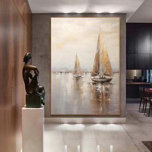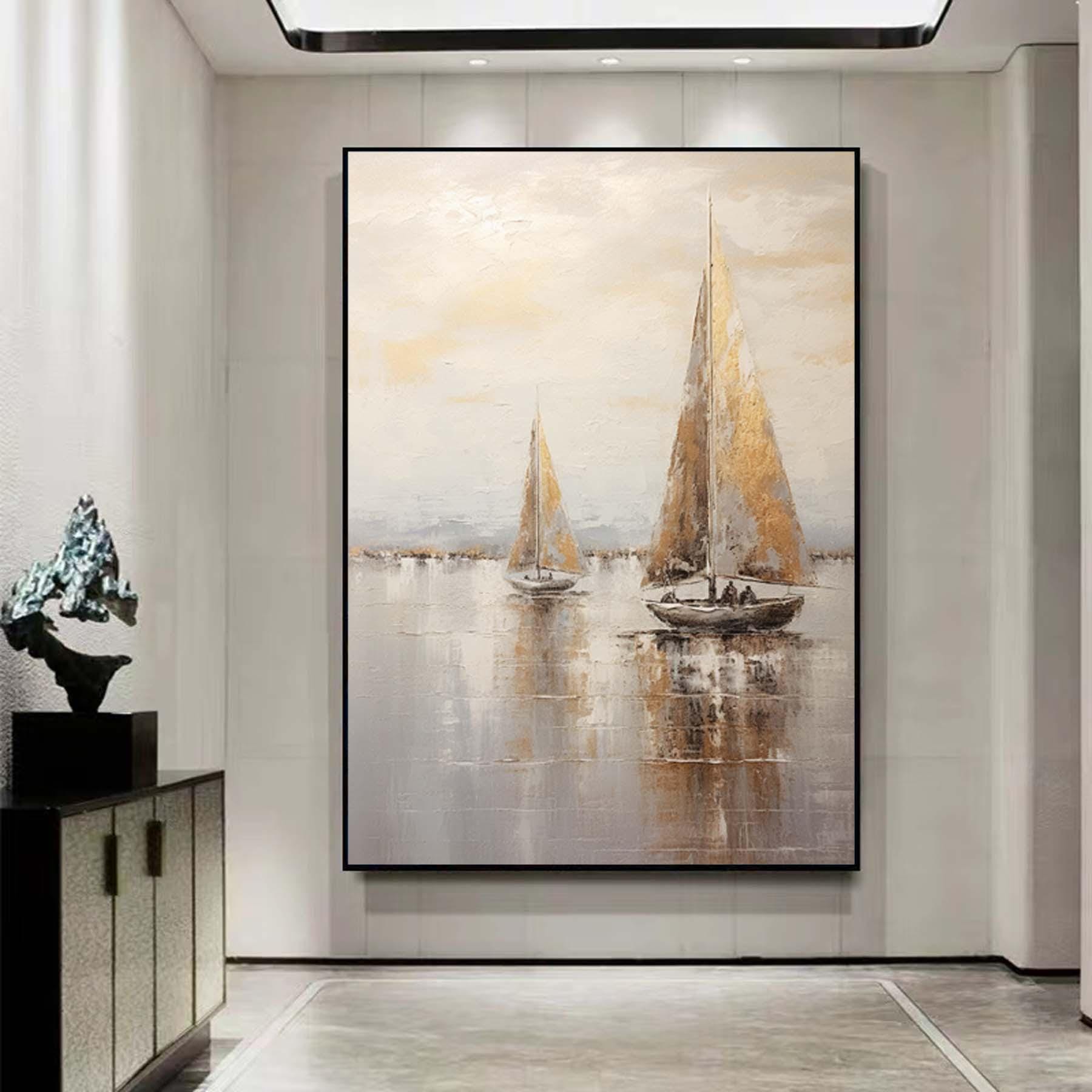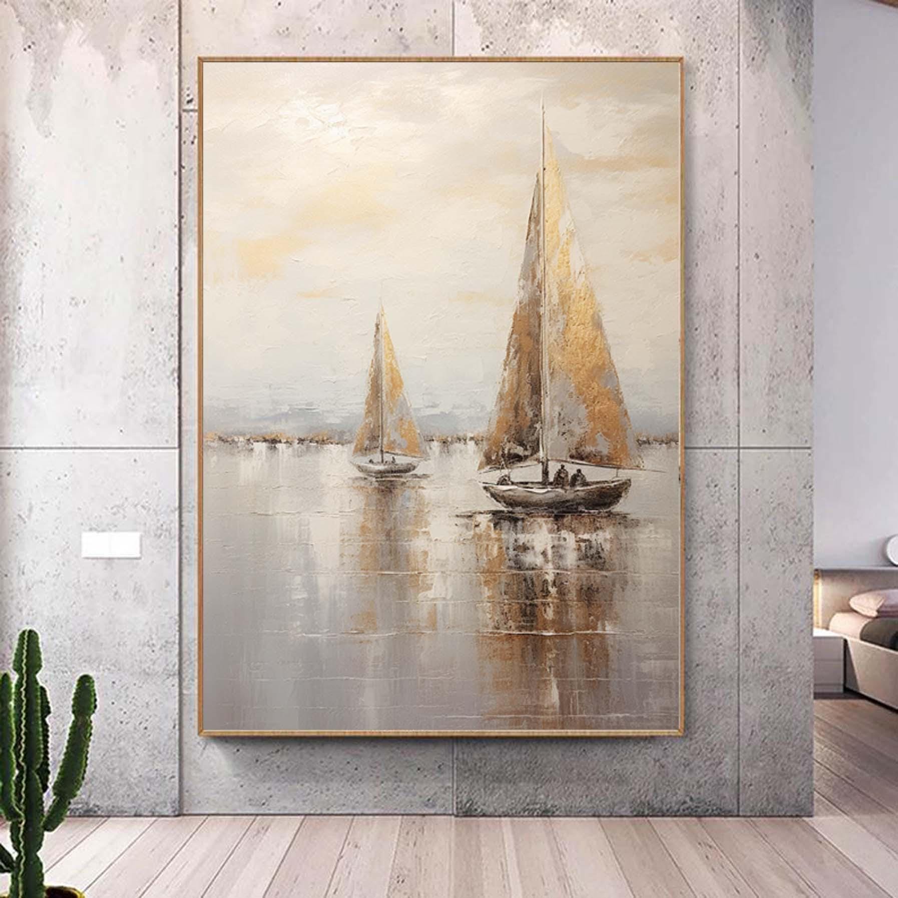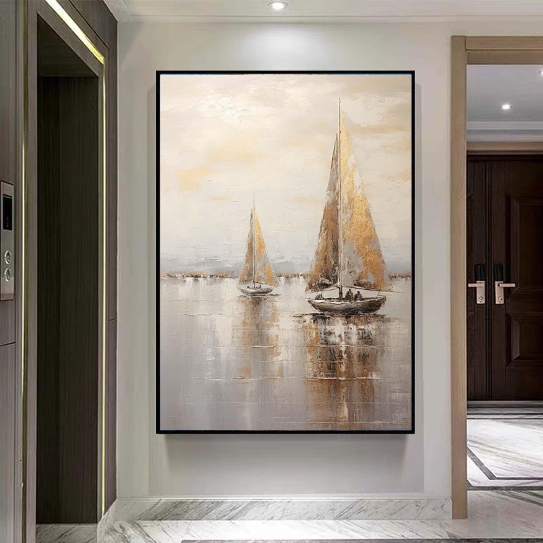 Large sailboat oil painting,Gray Gold Abstract Port Morning Sundown Wall Art,Original landscape to paint Artwork,Nautical oil painting art
