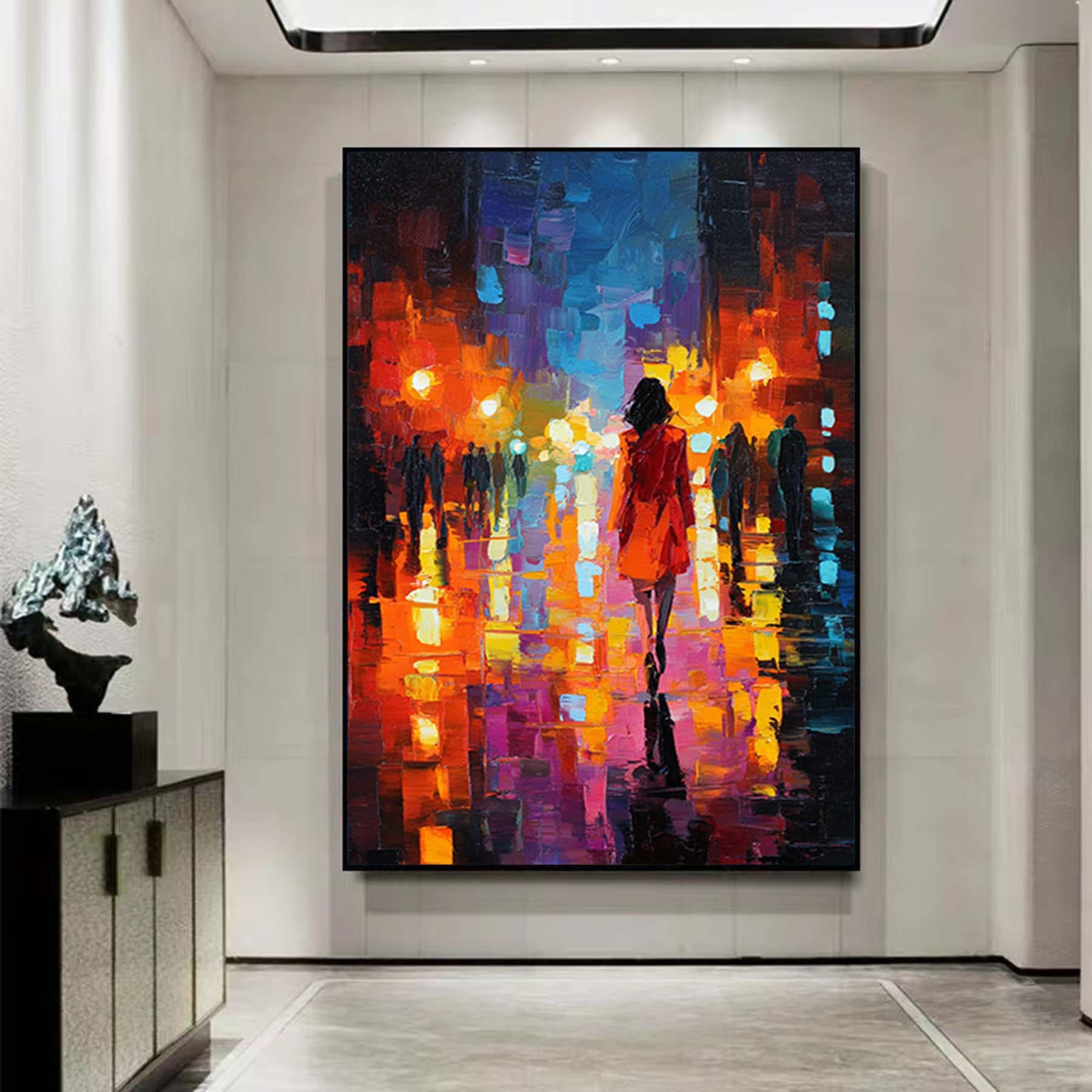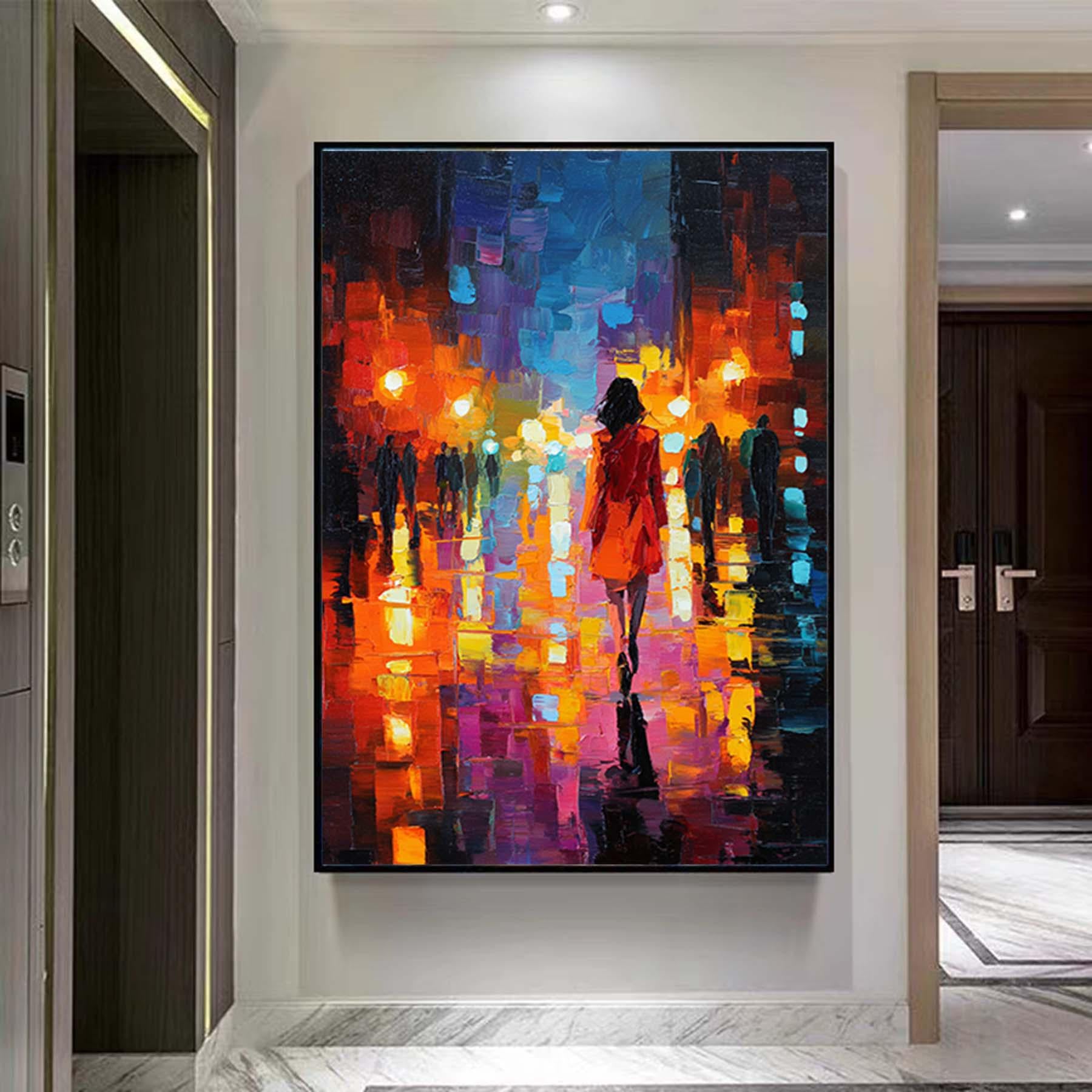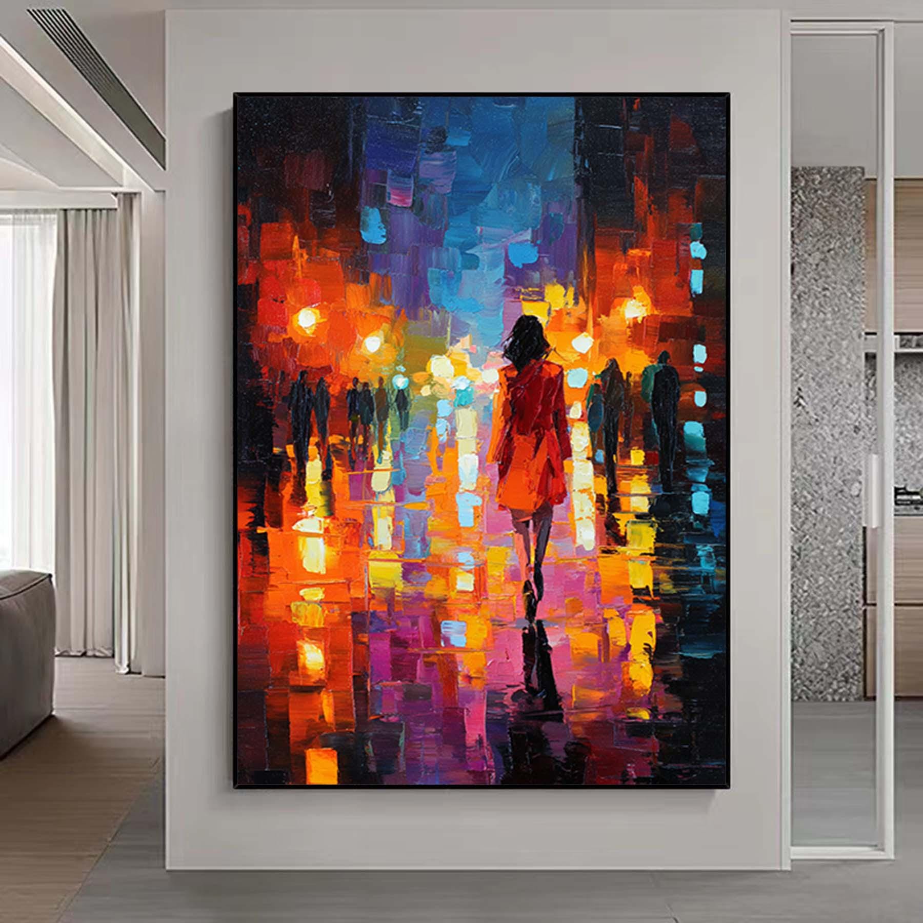 Abstract Girl Walks at Night Street Painting,Impressionism Textured Wall Art,Oversized Figurative Canvas Art,Large Living Room Artwork