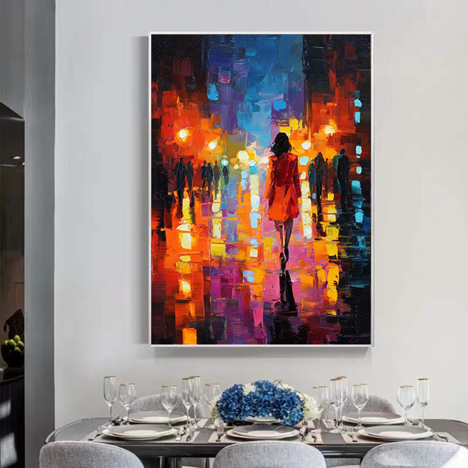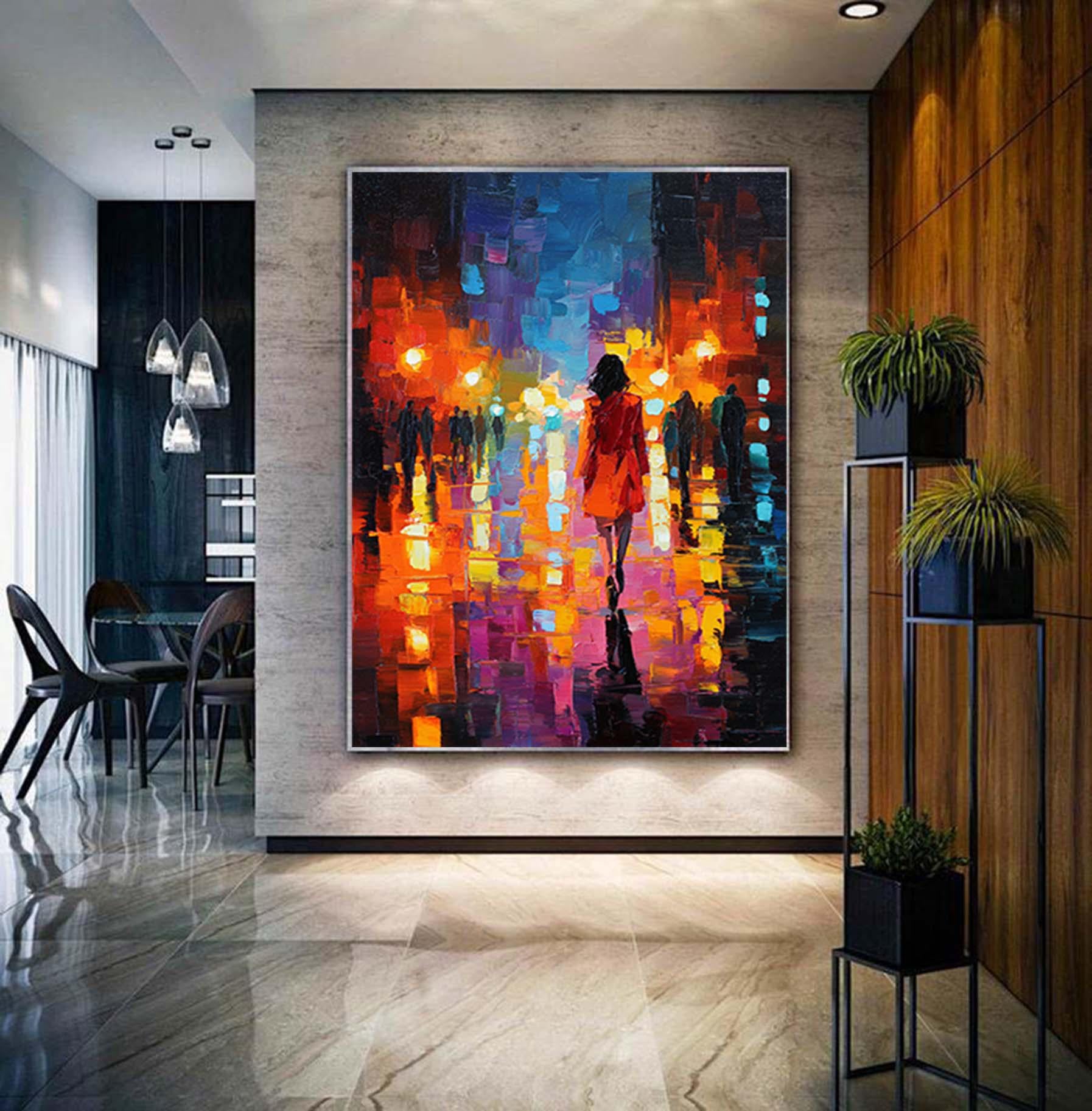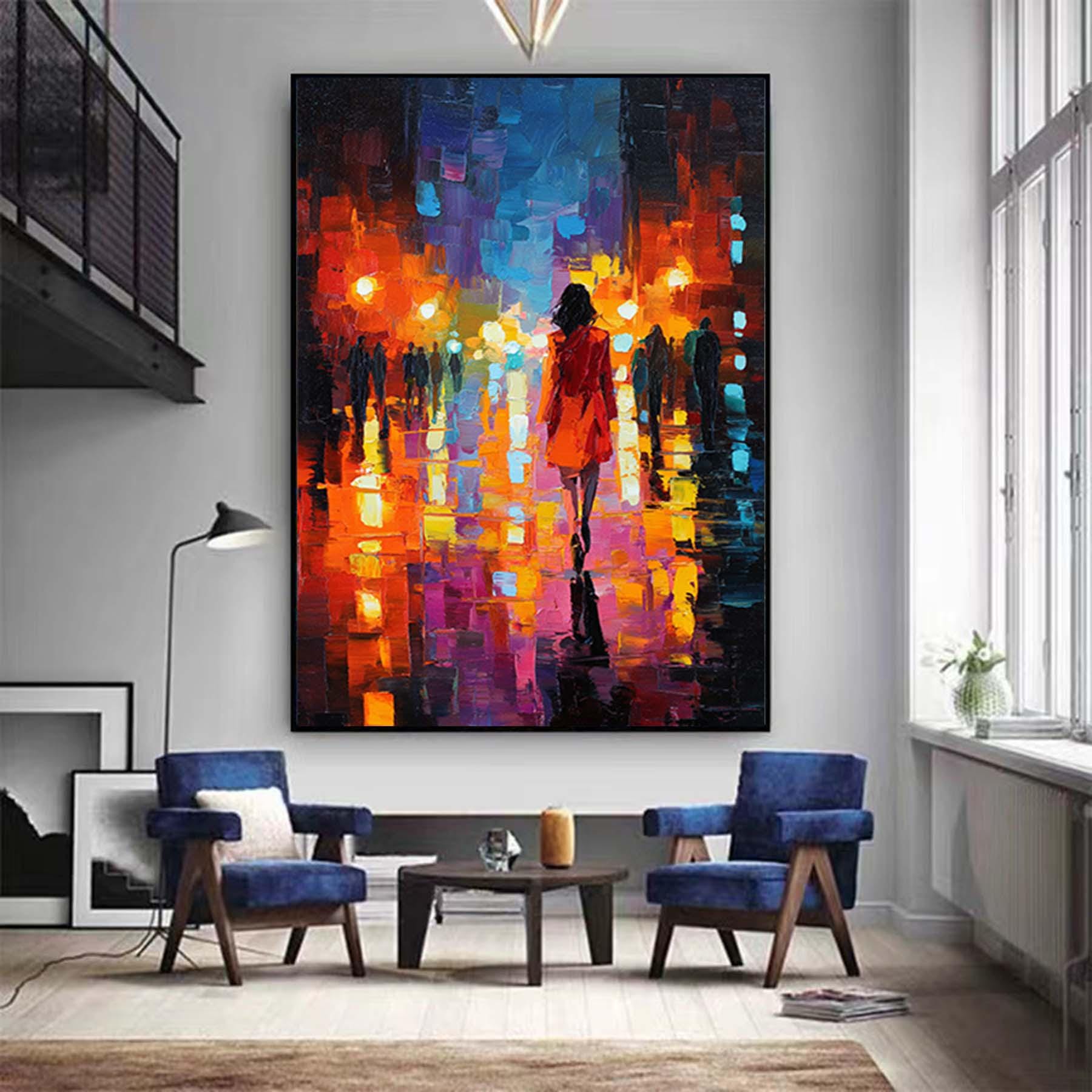 Abstract Girl Walks at Night Street Painting,Impressionism Textured Wall Art,Oversized Figurative Canvas Art,Large Living Room Artwork